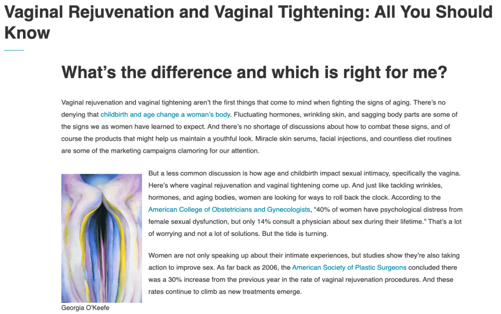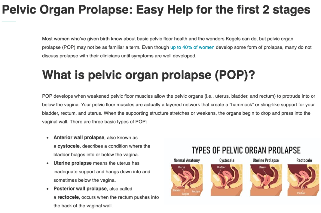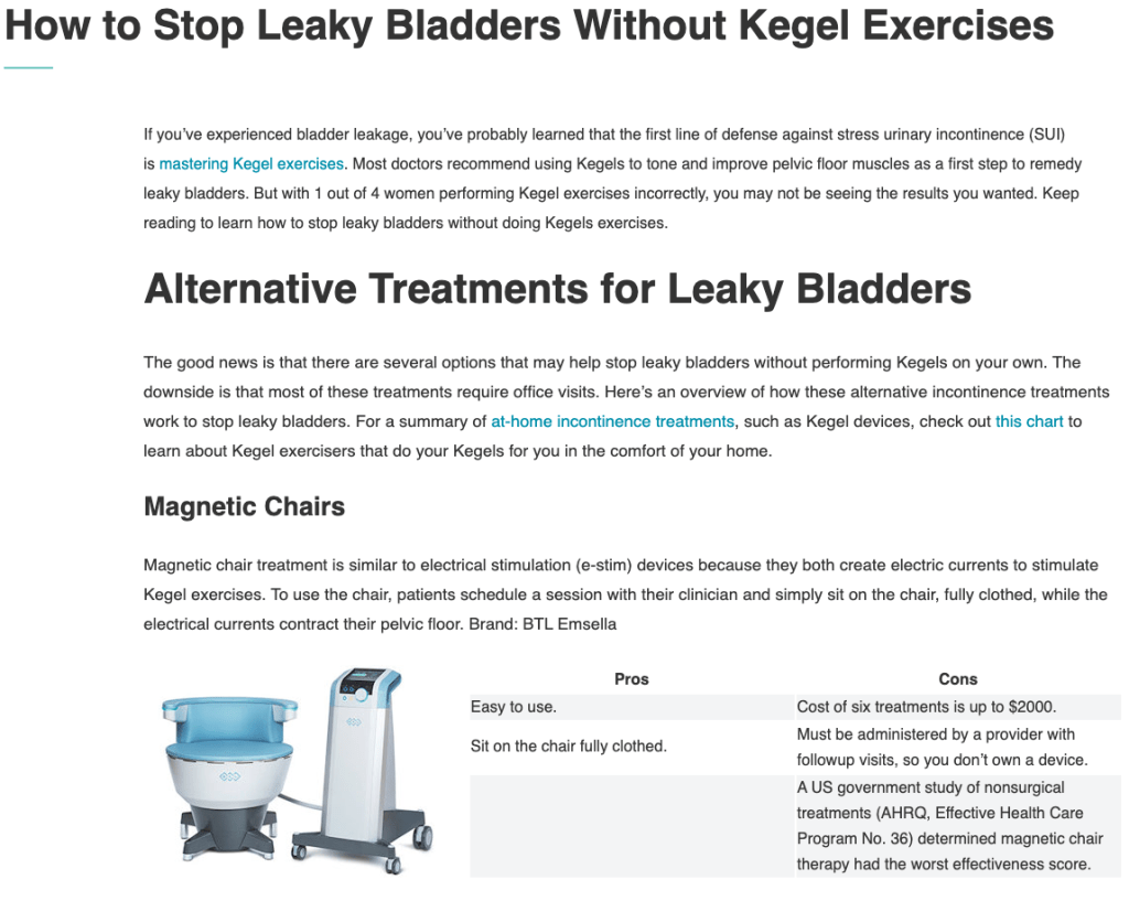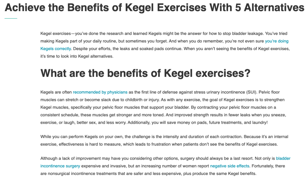 Below are images linked to articles that showcase my writing and editing for Elidah, a women’s health company that educates women about issues around incontinence. ELITONE is the company’s first FDA-cleared device to help those struggling with incontinence. My work includes writing original articles and transforming medical research into approachable copy for the consumer-facing blog. I also copy edited existing posts and pages, as well as email campaigns. Other tasks include developing interactive charts, and implementing analytics and SEO to highlight pages that convert to sales.