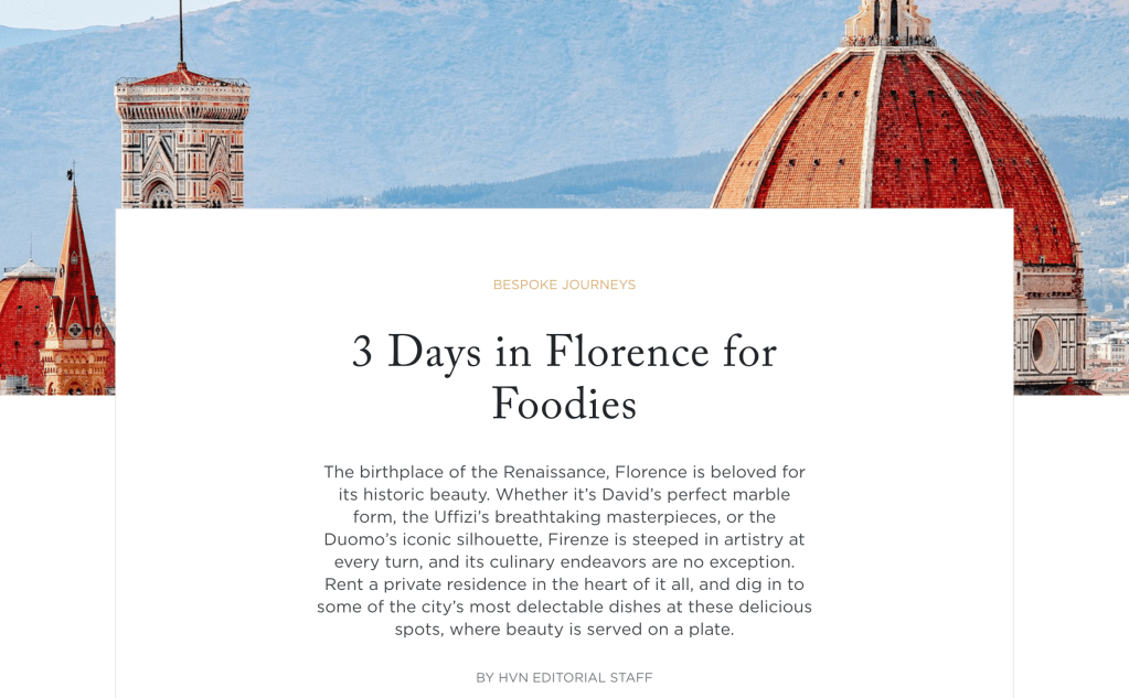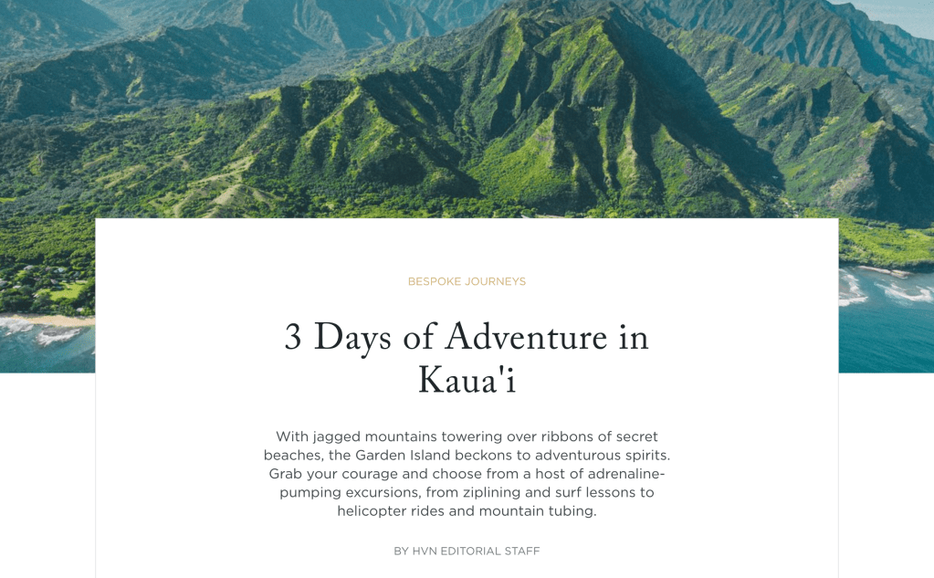 HVN is a dynamic travel tech company offering more than 200,000 professionally managed properties around the globe to member travel advisors. As Marketing & Editorial Operations Lead, I help manage editorial workflow and provide copywriting for product initiatives. In addition to member-facing content, I refine internal communication and data-tracking strategies across teams.